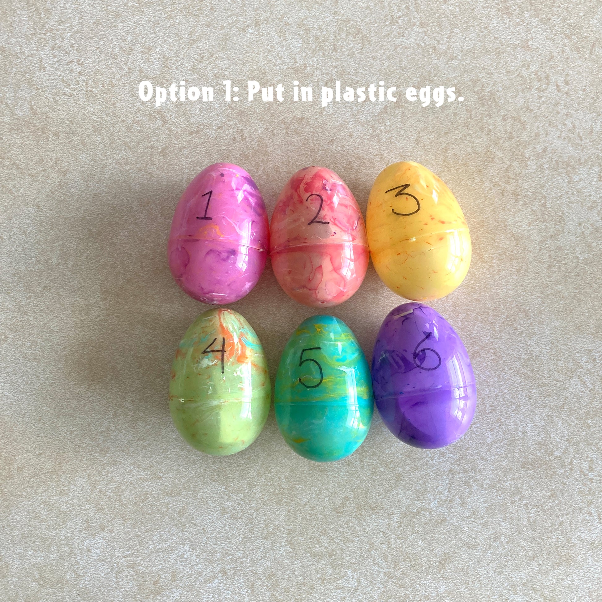 Option 3: Purchase a set of larger plastic eggs (we got a 6-pack at Michaels for cheap). Roll the squares. As you open each egg and read, glue each square and color. Repeat until the story is completed.
